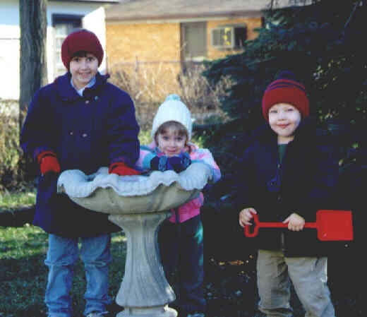 Katie, Megan and Jonathan checking out Grandma's frozen birdbath.