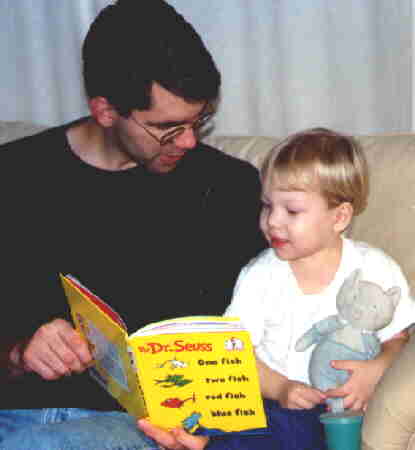 Dad, Jonathan and Tom Kitten enjoying a good book.