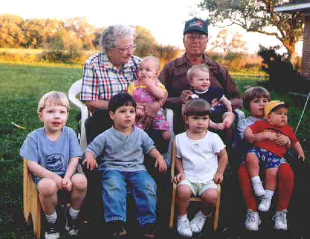Mutter and Grandpa (Laurie's grandparents) with all their great-grandchildren. From left: Jonathan Grayson, John Michael Hammack, Mary Grayson, Megan Hilscher (front), Lilia Conklin, Corrie and Kyle Hunter.