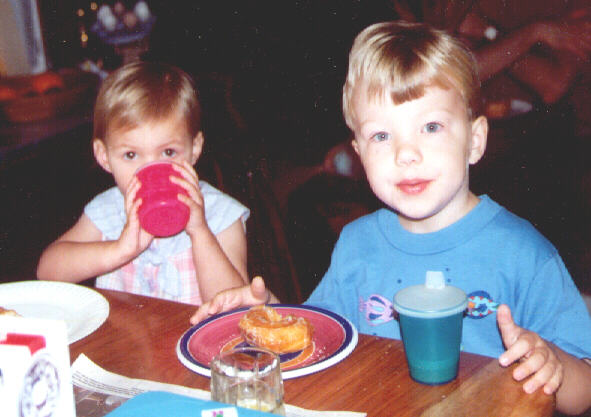 Whenever we stay at Grandpa John's, we always have Shipley's donuts and chocolate milk (or at least the kids do). This was Easter morning, so it was important to start building up their sugar levels as early as possible... ;-) (4/23/00)