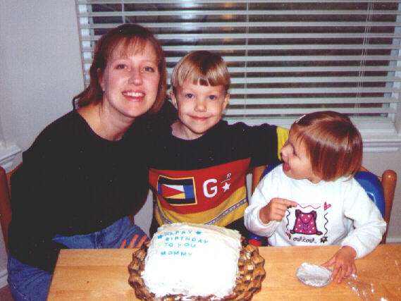 That's what the cake says. Jonathan put the letters on himself, with some spelling help from Dad. Mary licked frosting off of anything she could get her hands on.