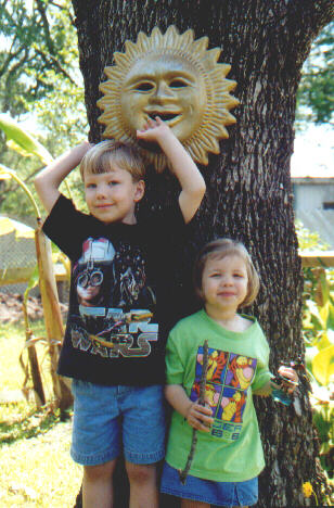 Jonathan and Mary measure up under one of Grandpa John's cool yard decorations. Jonathan's not really that much taller than Mary; he's just standing up on a root of the tree.