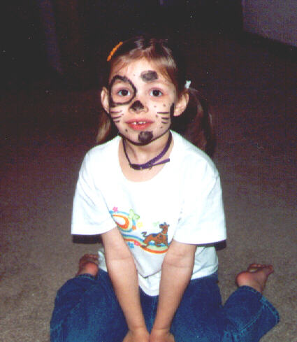 Mary made up in facepaint for her doggy-themed birthday party. And don't miss the collar, or the Scooby-Doo shirt!
