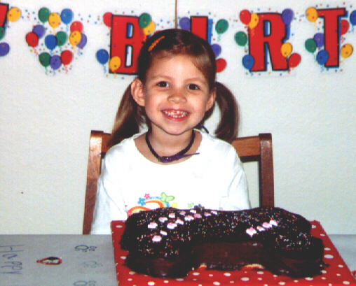 Mary with her cake. It's hard to make out from this picture, but in keeping with the doggy theme of her party, it's a giant chocolate-frosted dog bone.