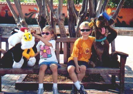 Jonathan and Mary played a total of about six carnival games during our trip to Six Flags Fiesta Texas. At two of them, they won the biggest prizes possible: Mary got the giant Sylvester and Tweety, and Jonathan got the giant Scooby Doo. They both insisted on sleeping with them that night, and for a couple of nights afterwards, but thankfully that didn't last long. (09/28/02)