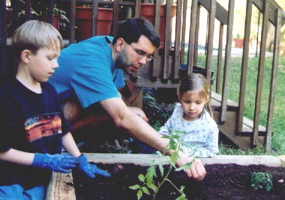 Jonathan and Mary help Dad plant our new garden. It's a 12 x 4 raised bed, and we planted it with tomatoes, hot peppers, and okra. We'll see how it does!