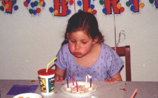 Mary blowing out her birthday candles at her big 5 year birthday party. The candles are stuck in blobs of icing around a big bunny-shaped sugar cookie. Can you tell she'd been running around having a good time just before this? (04/03)