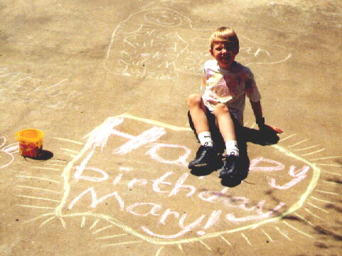 Jonathan wrote this on the driveway with chalk during the beginning of Mary's party. He was our big helper in running the party activities.