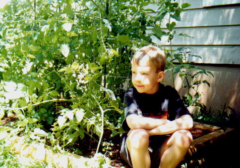 Jonathan poses on the side of our new vegetable garden. It really took off! This is the same spot visible in [Macro error: There is no glossary entry named "New Garden"] , but from the other side (from the steps). (05/03)