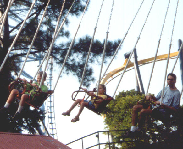 Jonathan, Mary and Dad on the Texas Tornado at Six Flags Over Texas. This was the surprise of the day, because riding it was all Mary's idea. She hadn't been on any of the faster rides all day, and then just as we were about to leave, she said she wanted to ride this giant spinning ride. And she loved it! The second time, her big brother even joined us. (07/03)