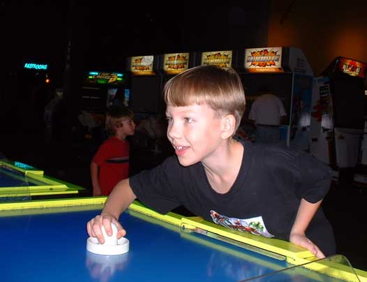 Jonathan playing air hockey at a friend's birthday party at Austin Park & Pizza (9/04)
