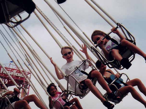 Ever since last year at Six Flags, Mary and Jonathan have both been big fans of this nauseating little ride. Thank goodness they're big enough to ride by themselves now! :-) (7/29/04)