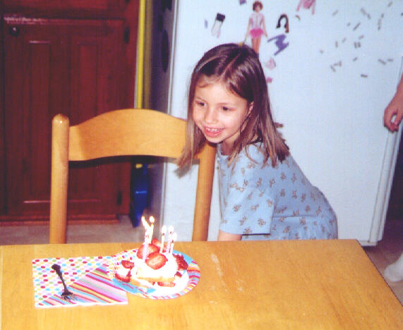 Mary, ready to blow out the candles on her strawberry shortcake birthday cake. This was on her birthday day, not at her party like last year's picture. (4/4/04)