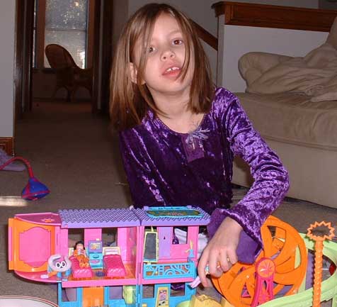 Mary playing with one of her many Christmas presents - a Polly Pocket set. (12/04)