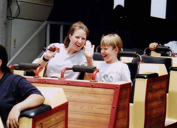 Mom and Jonathan starting his biggest coaster yet, the "Road Runner Express" at Fiesta Texas. They do love the coasters. (7/29/04)