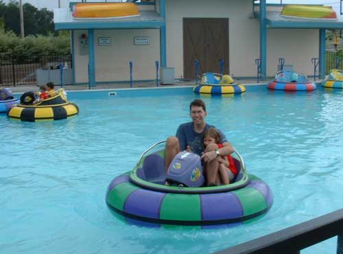 Somehow Dad got talked into this crazy drive-the-little-boat-with-a-water-cannon-on-it ride at Austin Park & Pizza. Mary's huddled in there too, for protection. (9/04)