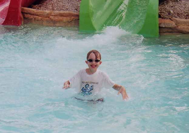 Jonathan emerging from the landing pool under the kids waterslide at Fiesta's waterpark. (7/29/04)