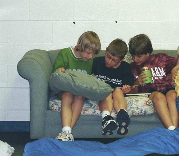 Jonathan and some buddies pore over... something. Must be Gameboy- or Pokemon-related (maybe both), judging by their intentness. (5/24/06)